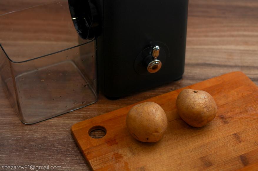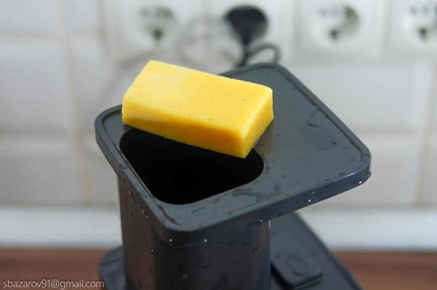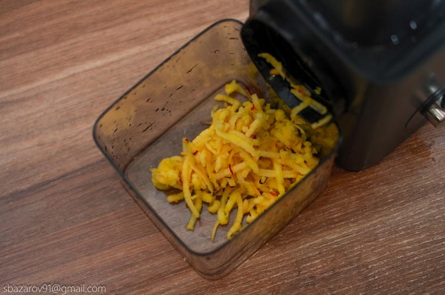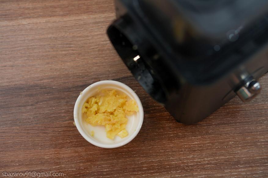 Ну и напоследок мелкая терка, которую можно проверить на самых сложных и одновременно нежных продуктах. Например, с её помощью можно натереть чеснок, имбирь или замороженное сливочное масло, а также пюрировать лук или измельчить цедру цитрусовых. Главный критерий в данном тесте — получение однородной кашицы без крупных кусочков, которые часто остаются при работе на обычных ручных терках (те участки, которые мы держим пальцами). В итоге получаем однородную массу в виде кашицы, которую можно использовать при готовке и даже в лечебных целях (имбирь добавлять в чай при простуде и вирусных заболеваниях).
