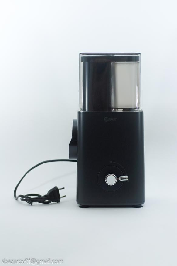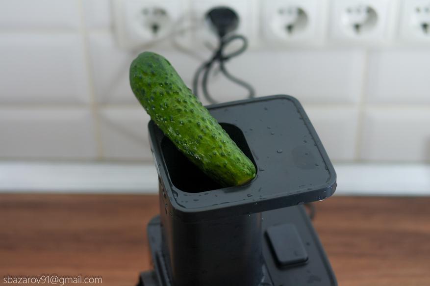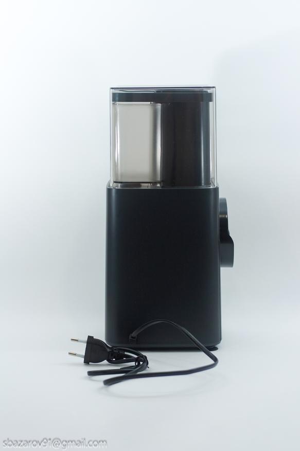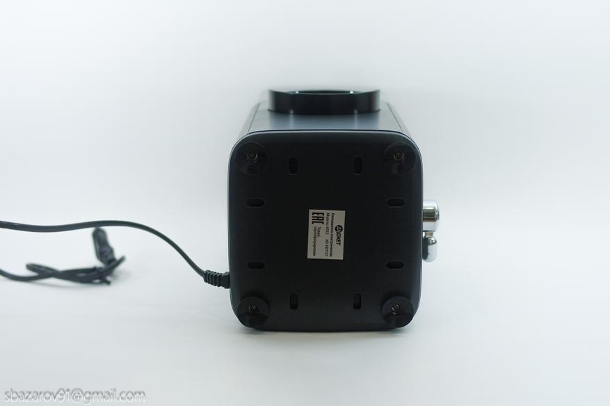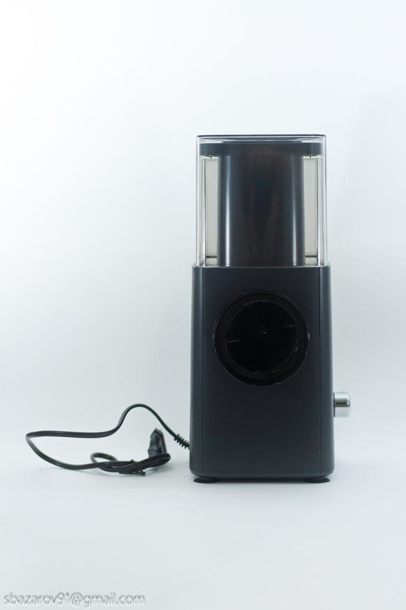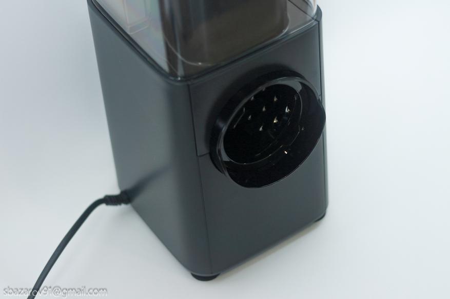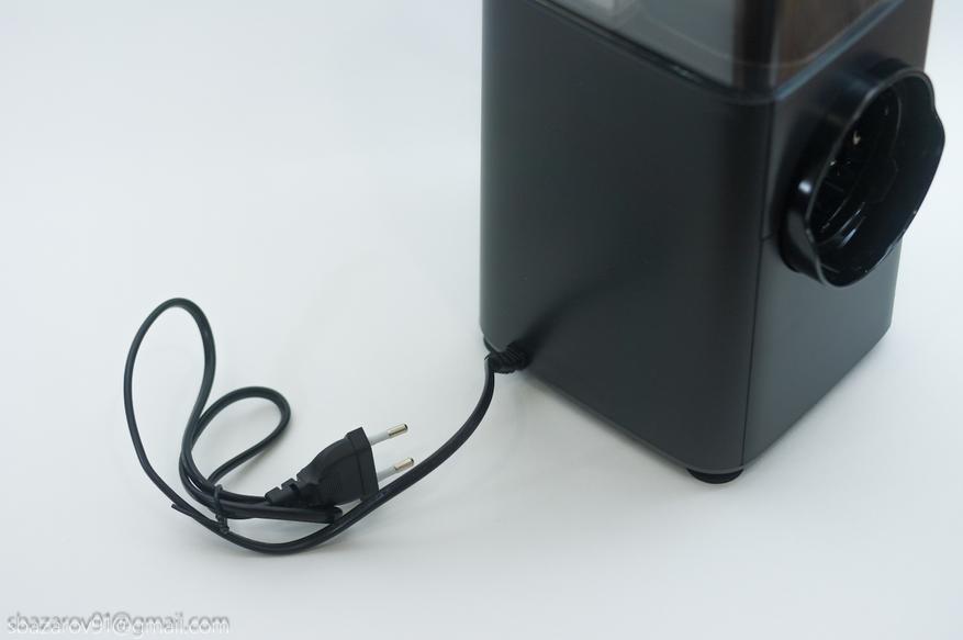 Так как корпус имеет вертикальное исполнение, для устойчивого положения овощерезки на рабочем столе имеются 4 прорезиненных ножки с присосками. Держится на столе довольно крепко, отрывать приходится с силой. Там же имеется множество отверстий для естественного охлаждения электромотора. Ну, а питание овощерезки происходит через шнур с EU-вилкой без заземления длиной 80 сантиметров.