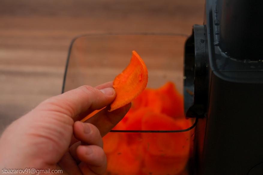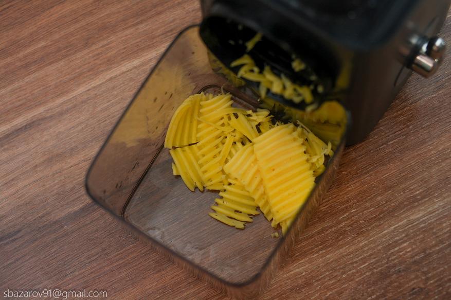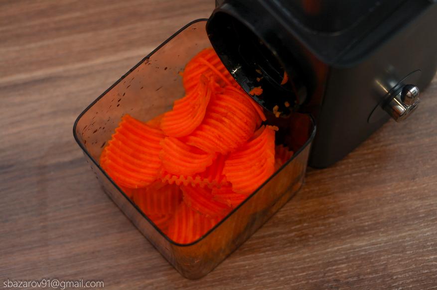 В качестве третьей насадки выступает «Для нарезки рифленых ломтиков», представляющая собой по большей части декоративную нарезку. Здесь отлично подойдет морковь или твердый сыр. Основная задача теста — проверить, насколько четко выражен рельефный рисунок и сохраняется ли он по всей длине ломтика. Такая нарезка идеальна для бутербродов, для использования в составе блюд или жарки во фритюре и аэрогриле. А нарезанный таким образом сыр отлично подходит для подачи к вину. И если сравнивать вкусовые ощущения, то рифленая морковь как будто вкуснее аналогичных слайсов.