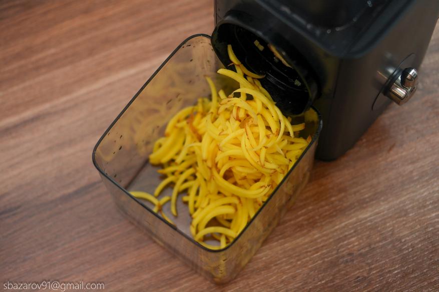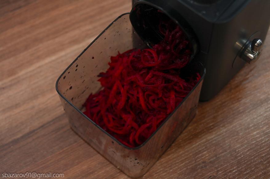 Чтобы максимально раскрыть возможности всех пяти пар насадок и проверить работу овощерезки, было решено провести тестирование, охватывающее как стандартные задачи, так и проверку на «сложных» продуктах, среди которых имбирь, свекла и чеснок.