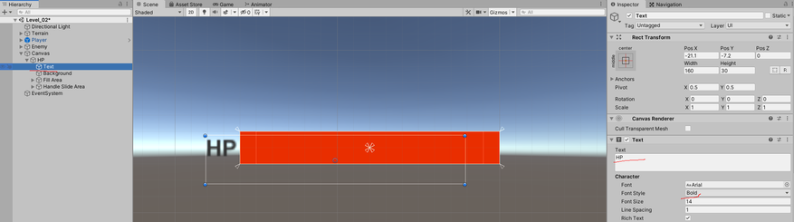 Теперь мы можем переименовать наш Slider в HP и добавить текстовое описание строки. Правой кнопкой нажимаем на наш Canvas->UI-Text, после прикрепляем текст к нашему HP перетащив его в иерархию HP, и в inspector в строке text пишем HP, выбираем Font Size — > Bolt что бы его было лучше видно, и позиционируем его как Вам будет удобнее.Позиционируется он очень просто выбираем его в иерархии и просто передвигаем на нужно место.