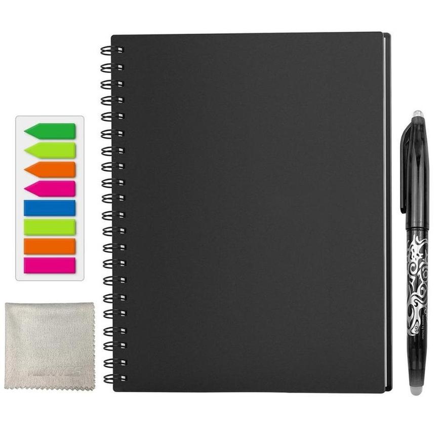 Очень интересный блокнот с листами, которые можно многократно использовать для записей. Страницы выполнены из тонкого пластика, есть варианты в линейку, клетку и точку. Писать и рисовать нужно специальной ручкой идущей в комплекте (можно также приобрести отдельно ручки и стержни к ним). Написанное стирается с помощью ластика на ручке, слегка влажной тряпкой или с помощью нагрева, например, феном. Кроме этого, есть специальное приложение для смартфона, которое позволяет организовать хранение того, что было ранее нарисовано или написано в блокноте. В тетради 30 листов, формат А5 или B5. Очень удобно использовать на работе, стирая уже устаревшую, записанную ранее информацию.