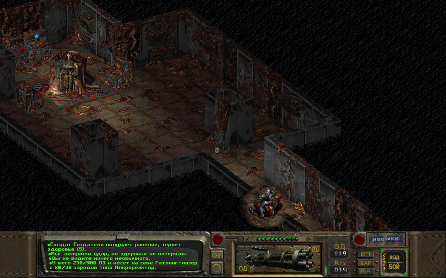 В первом Fallout достаточно оружия, чтобы расправиться с создателем и его армией. Правда, изначально стоит выбирать либо тяжёлое, либо энергетическое оружие. Ну или оба сразу, но лучше энергетическое. В игре довольно быстро можно получить плазменную винтовку в Свечении, и улучшить её в Могильнике (Boneyard). Также при высоком значении «Удачи» можно практически в самом начале игры получить бластер пришельцев, и тогда проблем с прохождением вообще не возникает. Для получения лучшей брони можно просто взять «ремонт» основным навыком и починить броню в Братстве Стали. Также раздобыть химические журналы и улучшить её всё в том же Могильнике. Дело ли это игру хуже? Становилось ли от этого неинтересно играть? Нет, становилось только лучше.
