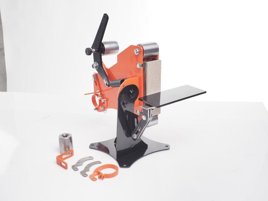 Ленточный гриндер — компактный и универсальный шлифовальный станок с ярко-оранжевым корпусом, оснащённый шлифовальными лентами (длина — 915 мм, ширина — 50 мм), опорными столиками с регулировкой по высоте и углу наклона (до 90°), поворотной станиной, винтом тонкой регулировки ленты и съёмным модулем для финишной шлифовки с абразивным кругом Р220 (⌀ 125 мм). Работает от угловой шлифовальной машины (УШМ) с диском 115-125 мм, подходит для бытовых (500-900 Вт) и полупрофессиональных (до 1,8 кВт) моделей. Способен обрабатывать дерево, керамику, металл, пластик, очищать поверхности от ржавчины и старой краски, точить инструменты, торцевать трубы. Скорость движения ленты — 20 м/мин, частота вращения — 10 000 об/мин, потребляемая мощность — 0,1 Вт. Габариты рабочего стола: 200 x 80 мм, вес — 12,63 кг.