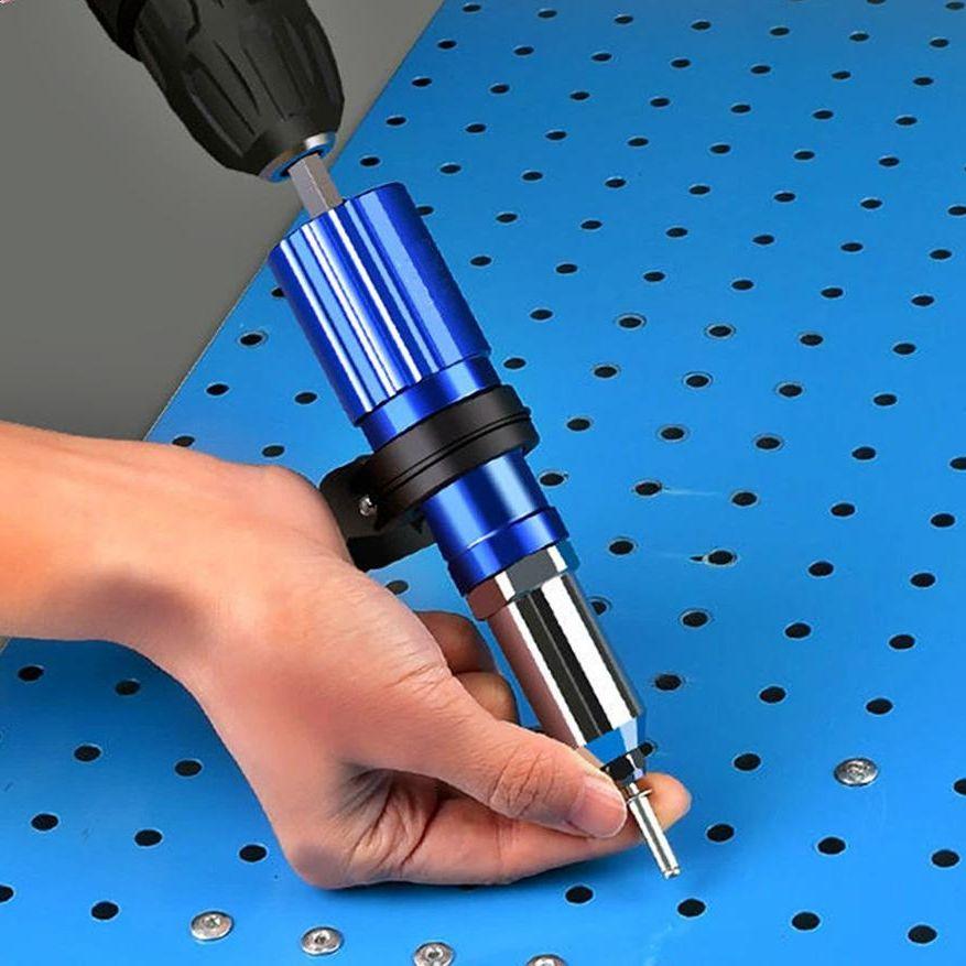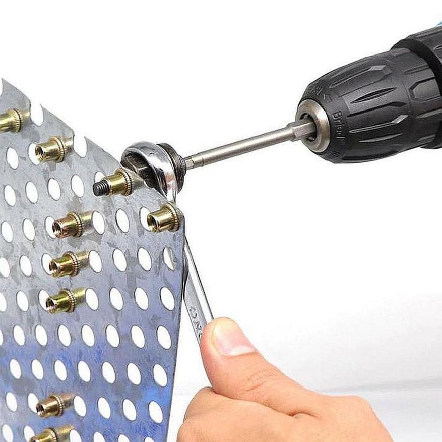 Более прочными, по сравнению с алюминиевыми, являются металлические винтовые заклепки, изготовленные из стали. Они подойдут не только для тонколистовых материалов, но и для фиксации более серьезного крепежа типа винтов или болтов. Данный вариант клепок востребован, когда требуется обеспечить надежное и разъемное соединение. Например, для соединения профилированных труб, когда нет возможности доступа с обратной стороны отверстия. При работе адаптер частично расплющивает стальную заклепку с обеих сторон профиля, что обеспечивает гораздо большую площадь контакта с крепежом и работает в качестве настоящей и прочной гайки. В установленную винтовую заклепку можно закрутить стандартный винт соответствующего размера. Периодически использую данную насадку на даче, работает нормально, клепки держат надежно. Адаптер имеет в конструкции цилиндровый подшипник, работать шуруповертом нужно на минимальных оборотах, но с высоким моментом. Размеры винтовых соединений заклепок от М3 до М10.