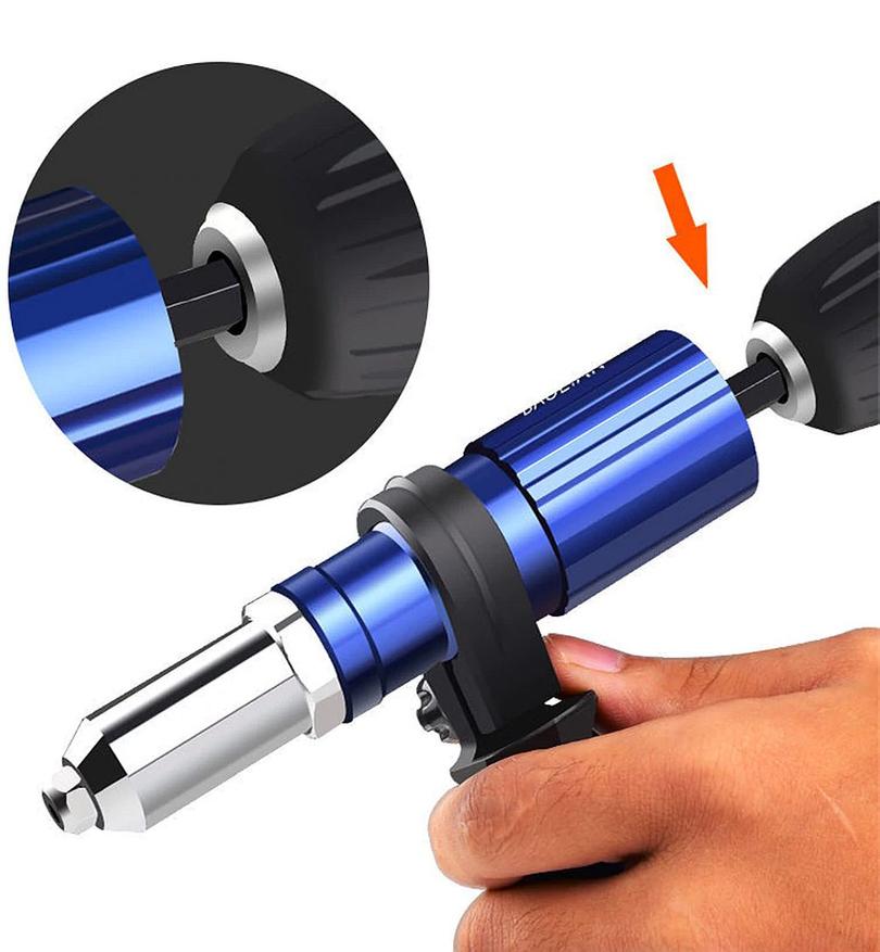 Алюминиевая клепка является одним из вполне надежных видов крепежа, обеспечивающего соединение плоских деталей из металла, пластика итд. Особенно клепки полезны, когда нет доступа с обратной стороны детали, можно просверлить отверстие, вставить заклепку и используя специальный инструмент, расклепать ее. Таким способом можно легко зафиксировать например, лист профнастила на трубе, соединить два металлически уголка итд. В продаже есть ручной инструмент для клепок, но более эффективно, особенно если их много или клепки имеют большой диаметр, воспользоваться адаптером для шуруповерта — сил и времени на установку уйдет гораздо меньше. Адаптер полностью изготовлен из металла, имеет удобную рукоятку, хвостовик под шестигранник. В комплекте набор сменных губок для разного диаметра клепок (2.4-4.8 мм)