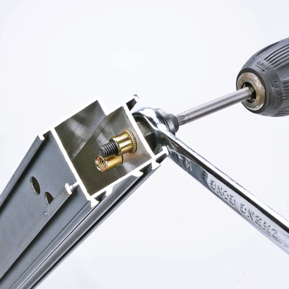 Еще один адаптер, но уже для установки винтовых клепок в тонколистовые поверхности. Такие клепки нужны чтобы обеспечить надежное соединение, например, полых профилированных труб без возможности доступа с обратной стороны отверстия. Установленная клепка зажимается с обеих сторон профиля, работает как гайка и дает большую площадь контакта с крепежом. В установленную винтовую клепку можно вкрутить обычный винт соответствующего размера. Пробовал ставить такие клепки в алюминиевый профиль трубок теплицы на даче, отлично держат соединение в отличие от обычных саморезов. Адаптер имеет в своем составе подшипник с цилиндрами и используется с шуруповертом. Размеры от М3 до М10.