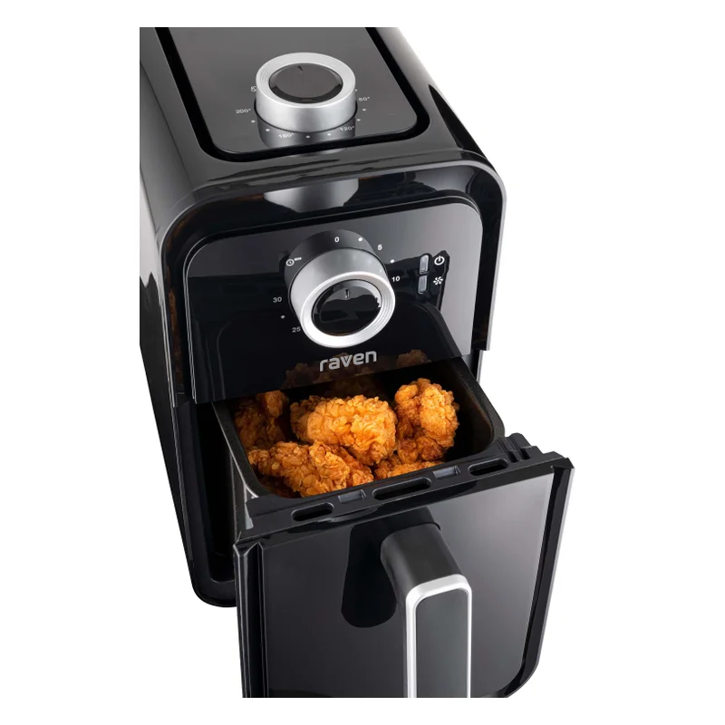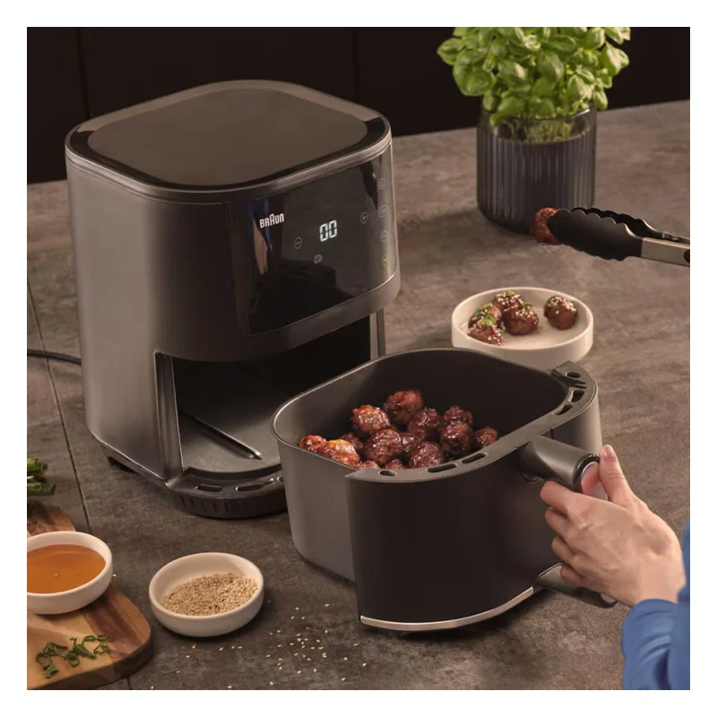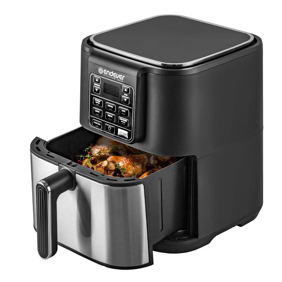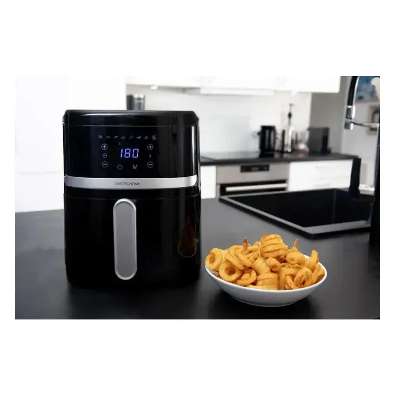 Аэрогриль с мощностью 1350 ватт и чашей объёмом 4,5 литра, поддерживающий восемь программ приготовления. Устройство оснащено электронным термостатом, LED-дисплеем, таймером и термопарой для равномерного нагрева. Съёмные части можно мыть в посудомоечной машине, а нескользящие ножки обеспечивают устойчивость на поверхности. Это компактное и функциональное устройство подходит для повседневной готовки с минимальным количеством масла.