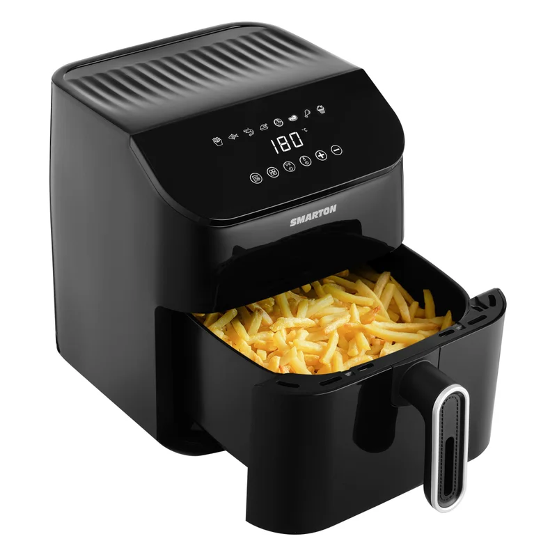 Аэрогриль объёмом 6 литров и мощностью 1500 ватт, предназначенный для быстрой и разнообразной готовки с минимумом масла. Он поддерживает десять автоматических программ, имеет электронный термостат и таймер, а также функцию поддержания тепла. Важное отличие — возможность удалённого управления через приложение Tuya Smart, что позволяет контролировать процесс через смартфон. Корзина прямоугольной формы и стильный чёрно-серый корпус делают прибор практичным и вписывающимся в любой интерьер.