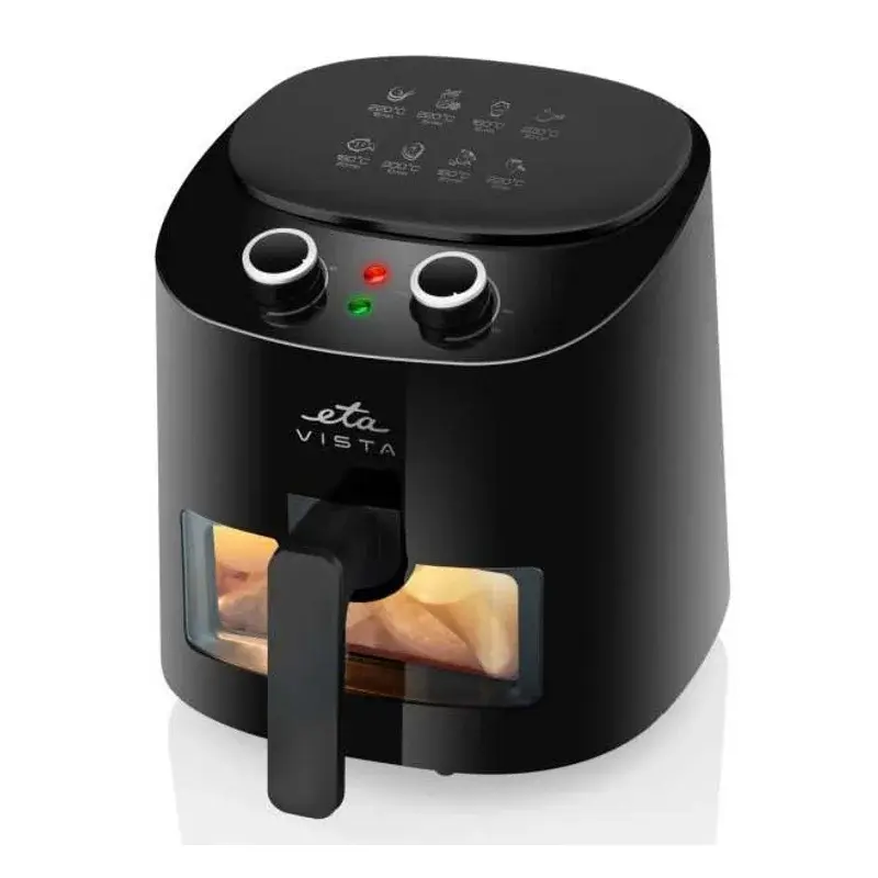 ETA Vista отличается максимальной температурой до 220 градусов и механическим термостатом. Мощность 1300 ватт и объём чаши 4,3 литра обеспечивают стандартные возможности для жарки, выпечки, гриля и подогрева. Таймер и функция автоматического отключения повышают удобство и безопасность, а компактные размеры и чёрный корпус делают его удобным для любой кухни.