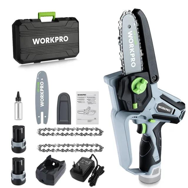Далее следует аккумуляторная пила от известного бренда Workpro, которая имеет ряд конструктивных отличий от вышестоящих моделей. По заявлению производителя, данная пила способна за 5-8 секунд распилить ветку диаметром от 3 до 10 сантиметров, в зависимости от твердости древесины.