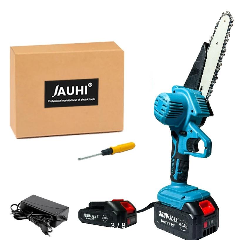 Аккумуляторная цепная пила Jauhi предназначена для лёгкой и средней работы на даче, в саду или частном доме. Эта модель является универсальной и очень похожей на вышестоящий инструмент. Небольшая направляющая шина длиной 6 дюймов обеспечивает удобный пропил веток и брёвен среднего диаметра, а литиевая батарея обеспечивает автономность без необходимости частой подзарядки.