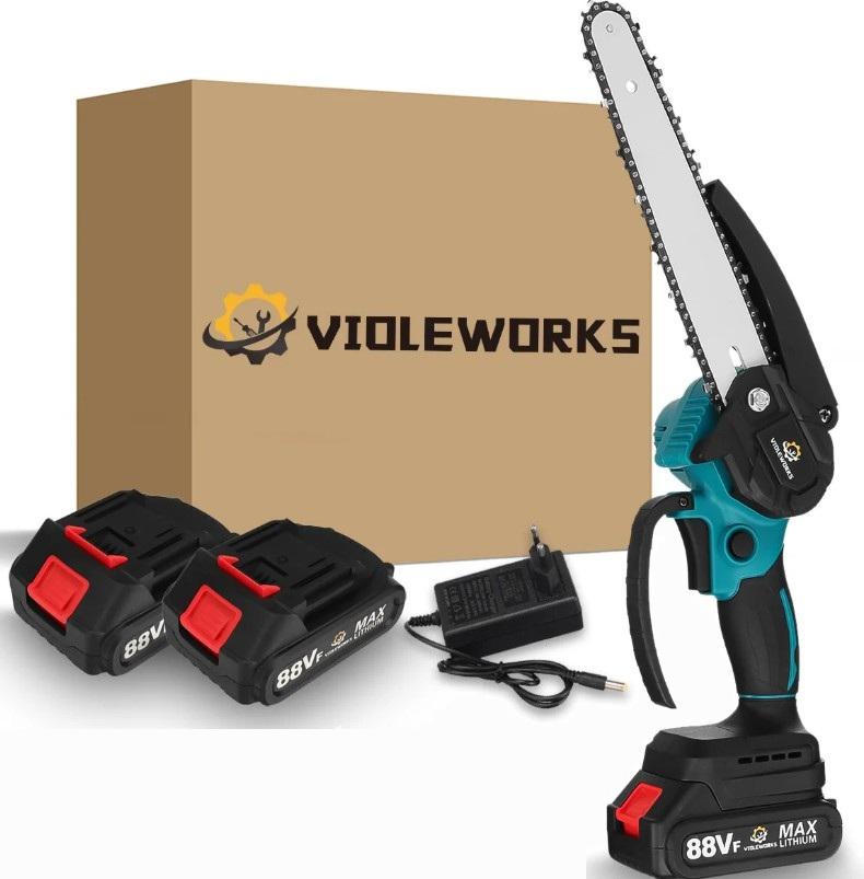 Цепная пила Violeworks уже оснащена шиной длиной 8 дюймов. Модель представляет собой более мощную и универсальную модель в линейке мини-пил, предназначенную для активного использования на частном участке, в саду или даче. Шина длиной 8 дюймов обеспечивает более глубокий и продуктивный пропил по сравнению с 6-дюймовыми моделями, что делает модель подходящей для работы с более толстыми ветвями и брёвнами.