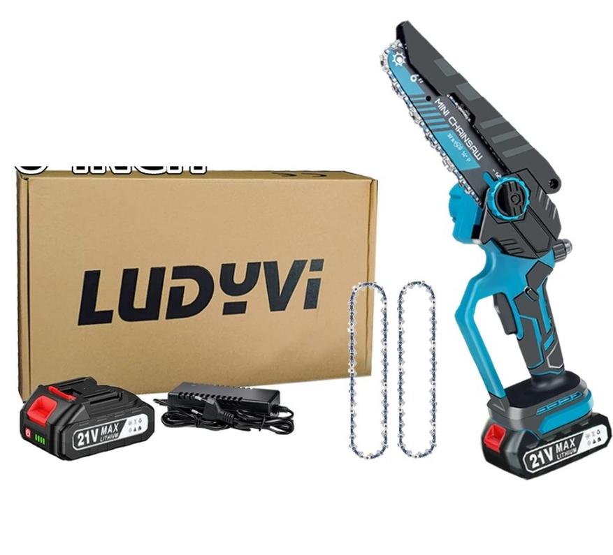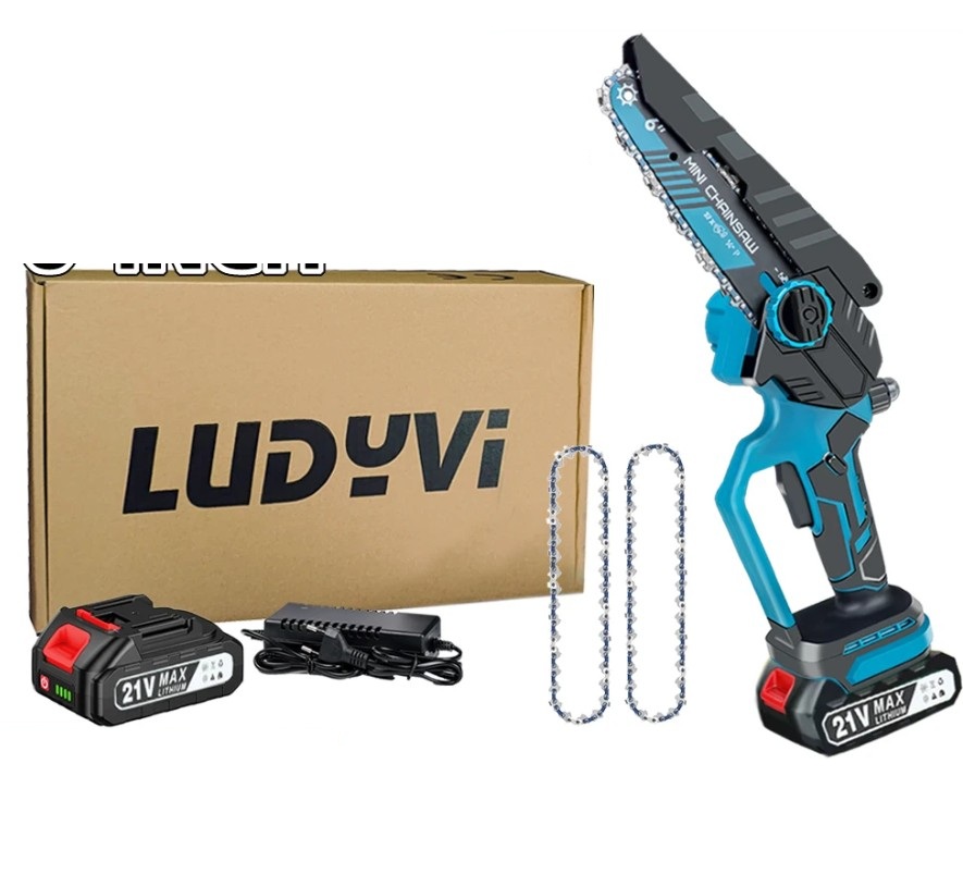 Пила Ludyvi достаточно дорогая, особенно если учесть, что она имеет шину 6 дюймов. Инструмент ориентирован на простоту и удобство в использовании. Сразу хотел бы отметить, что данная модель оснащена автоматической маслёнкой и мощным бесщёточным двигателем. Двигатель выдает до 3000 оборотов в минуту без нагрузки, что в комплекте с редуктором обеспечивает скорость цепи до 6 м/с. Лёгкий корпус с эргономичной ручкой снижает усталость при длительной работе, а система блокировки от случайного запуска повышает безопасность.