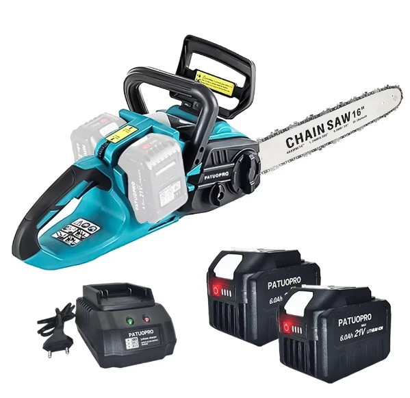 И замыкает подборку самая большая в подборке пила с шиной в 16 дюймов. Можно сказать, что по размерам это уже полноценная пила. Для питания в этой модели также используется два аккумулятора. В комплекте можно приобрести два аккумулятора на 8 Ач каждый, что позволит довольно свободно использовать пилу. Но есть и другие варианты источников питания.