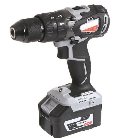 Прибор укомплектован одной аккумуляторной батареей на 4,0 А·ч. Кейс для хранения имеется. Устройство с точечной подсветкой и индикацией заряда батареи. Есть тормоз двигателя. Весит: 1,7 кг.
