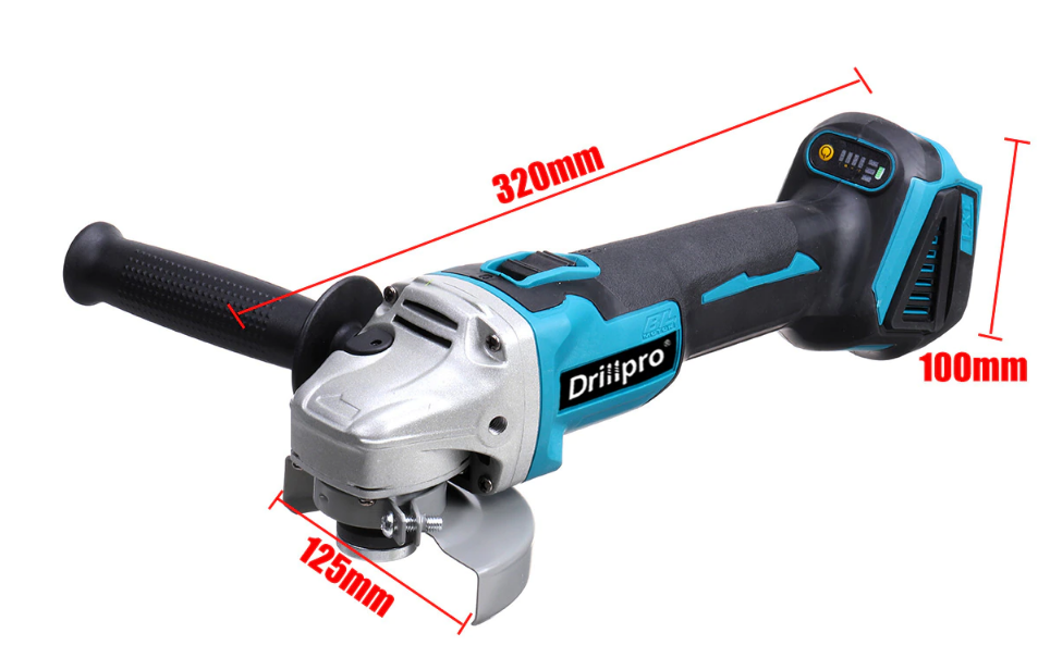 УШМ от фирмы Drillpro продается в двух модификациях с поддержкой кругов на 100 и 125 миллиметров. Двигатель инструмента обеспечивает вращение ротора со скоростью 10000 об\мин без нагрузки, при этом заявленная мощность устройства составляет 800W. УШМ совместима с аккумуляторами Makita на 18V, но они в комплект не входят, в описании есть перечень всех совместимых моделей аккумуляторов. При необходимости можно заказать доставку со склада, находящегося в России.