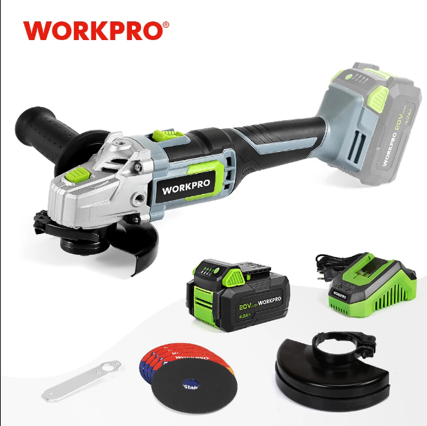 Еще одним из китайских лидеров на рынке инструментов является компания WORKPRO. Она также предлагает свою модель УШМ работающую на аккумуляторе. Инструмент комплектуется фирменным аккумулятором на 20V с электроемкостью на 4000 мАч, и зарядным устройством. Также в комплект поставки входит ряд отрезных кругов, для жителей РФ товар можно заказать с быстрой доставкой с местного склада. Модель не дешевая, но она имеет честные и хорошие характеристики, а компания в целом хорошо зарекомендовала себя.