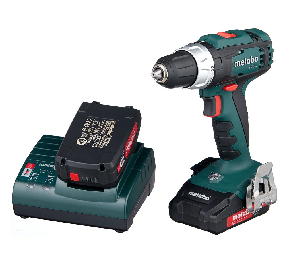 Крутящий момент у Metabo BS 18 L достигает на максимуме 50Нм, предельная скорость вращения вала двигателя: 450/1800 об/мин. Сверлильный патрон может зажимать кулачковым механизмом хвостовики оснастки до 10мм. Диаметр сверления стали: до 10мм, дерева/пластика: до 20мм. Масса: 1600 г. Инструмент идет в прочном кофре из пластика. Трехлетняя гарантия.