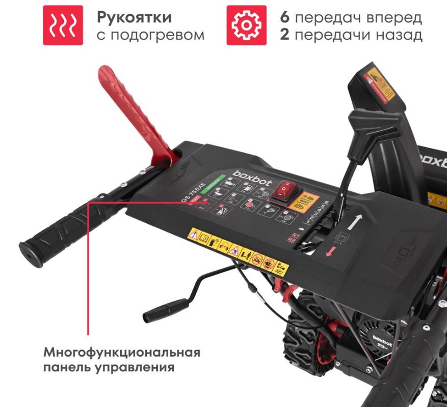 На третьем месте снова Boxbot GS 755XE, который отличается от младшей модели наличием электростартера от сети 220 вольт и несколькими удобствами для работы в темноте и холоде. Тот же двигатель на 212 кубов и семь сил, но заявлена стабильная работа до минус тридцати градусов. Ковш остался прежним 56 на 53 сантиметра, шнеки из металла с зубьями рубят и выбрасывают снег до двенадцати метров.
