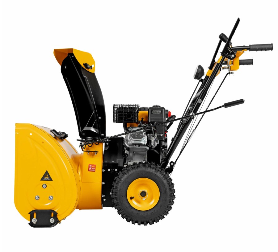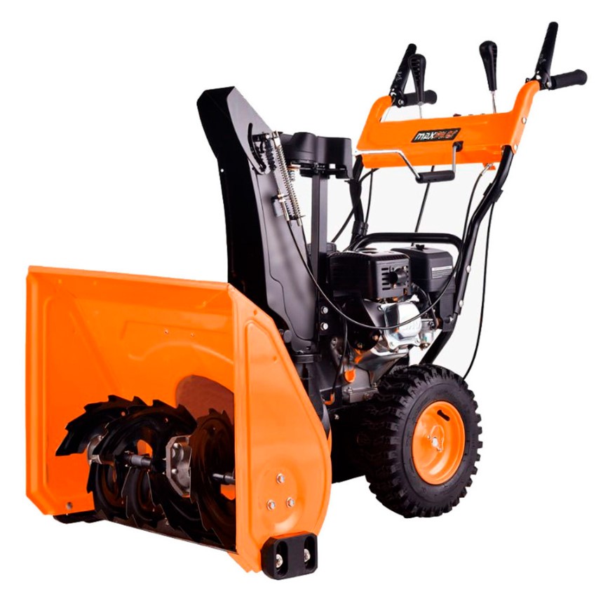 Бак для топлива вмещает 3,6 л. бензина, чего хватает на пару часов непрерывной работы. Ковш захватывает полосу шириной 56 сантиметров и высотой 53 сантиметра, шнеки из металла с зазубренами легко крошат плотный снег и лёд, а двухступенчатая система выбрасывает снег на расстояние до двенадцати метров. Желоб поворачивается почти на 190 градусов, управлять направлением можно прямо с панели, не останавливаясь.