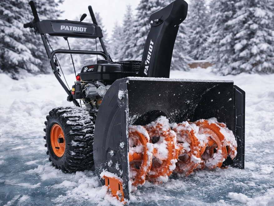 PATRIOT PS 707 E интересен тем, что при ширине захвата 71 см он остается довольно управляемым на узких проездах, где важен контроль, а не рекордный размах. Двухступенчатая схема выброса и металлический шнек с диаметром 30 см рассчитаны на работу по насту, когда снег уже успел слежаться и превратиться в плотный слой.