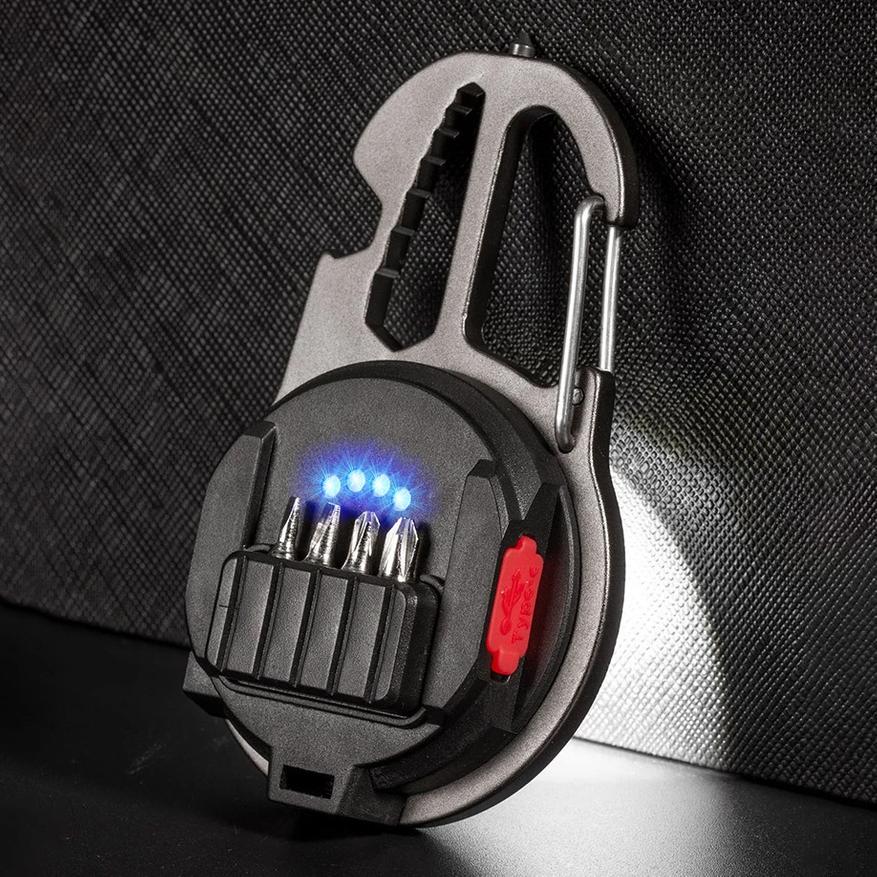Следующий брелок-мультитул произведен из алюминиевого сплава и предлагается в нескольких исполнениях, отличаюшихся дизайном. Встроенный фонарик на 500 люмен питается от аккумулятора на 500 мАч. Подзарядка последнего происходит через порт USB Type-C. Брелок оснащен гайковертом, открывашкой, держателем для бит (4 штуки в комлекте) и зажимом с магнитным креплением.