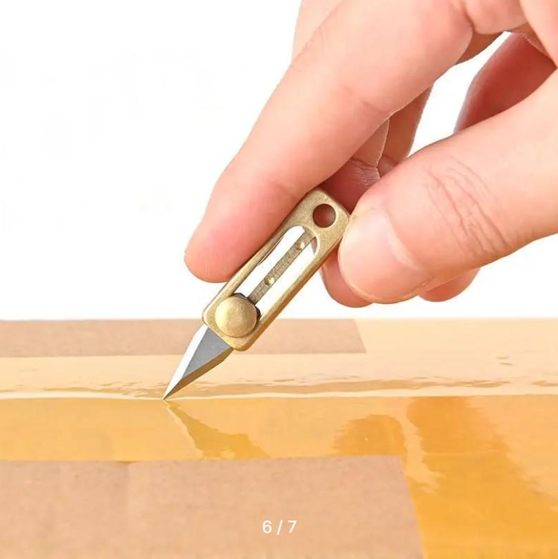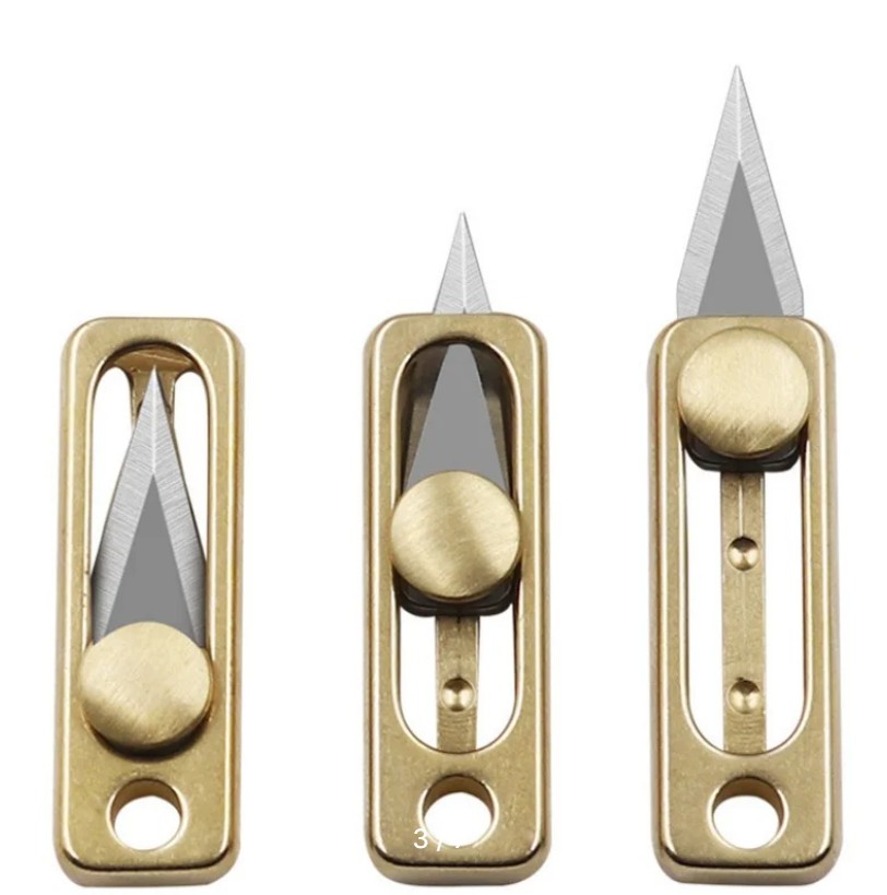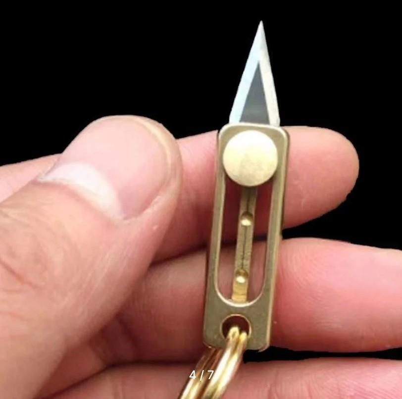 Этот нож может служить для вскрытия посылок или для подобных целей. Это очень маленький брелок из латуни, что придаёт ему золотистый цвет и не подвергает коррозии. Лезвие ножа из нержавеющей стали, при необходимости его даже можно немного заточить. А впоследствии предполагаю, что его можно даже заменить на сменное лезвие. Размер ножа в разложенном виде 47 мм, а длина лезвия 15 мм. В сложенном виде брелок-нож имеет длину 32 мм.