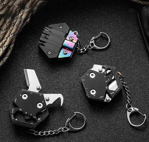Этот брелок представляет собой компактный мультитул, готовый к использованию в любой непредвиденной ситуации. В шестиугольном корпусе размером 38 на 43 мм закреплен набор из девяти функциональных инструментов.