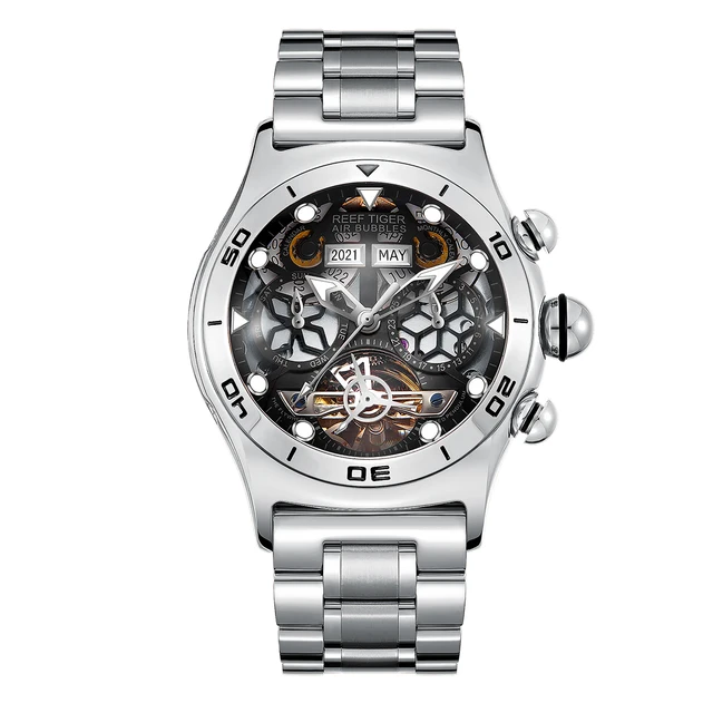 Полное PVD-покрытие отсутствует: стальной корпус имеет натуральный оттенок, сохраняя лёгкий блеск металла.