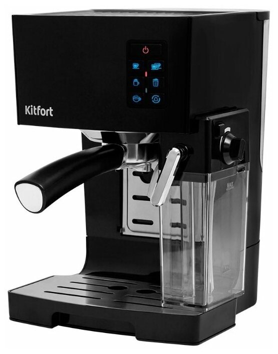 А это ещё одна кофемашина от компании Kitfort, однако данная модель имеет ёмкость для молока, что позволяет автоматически приготовить капучино или получить молочную пенку для других напитков.