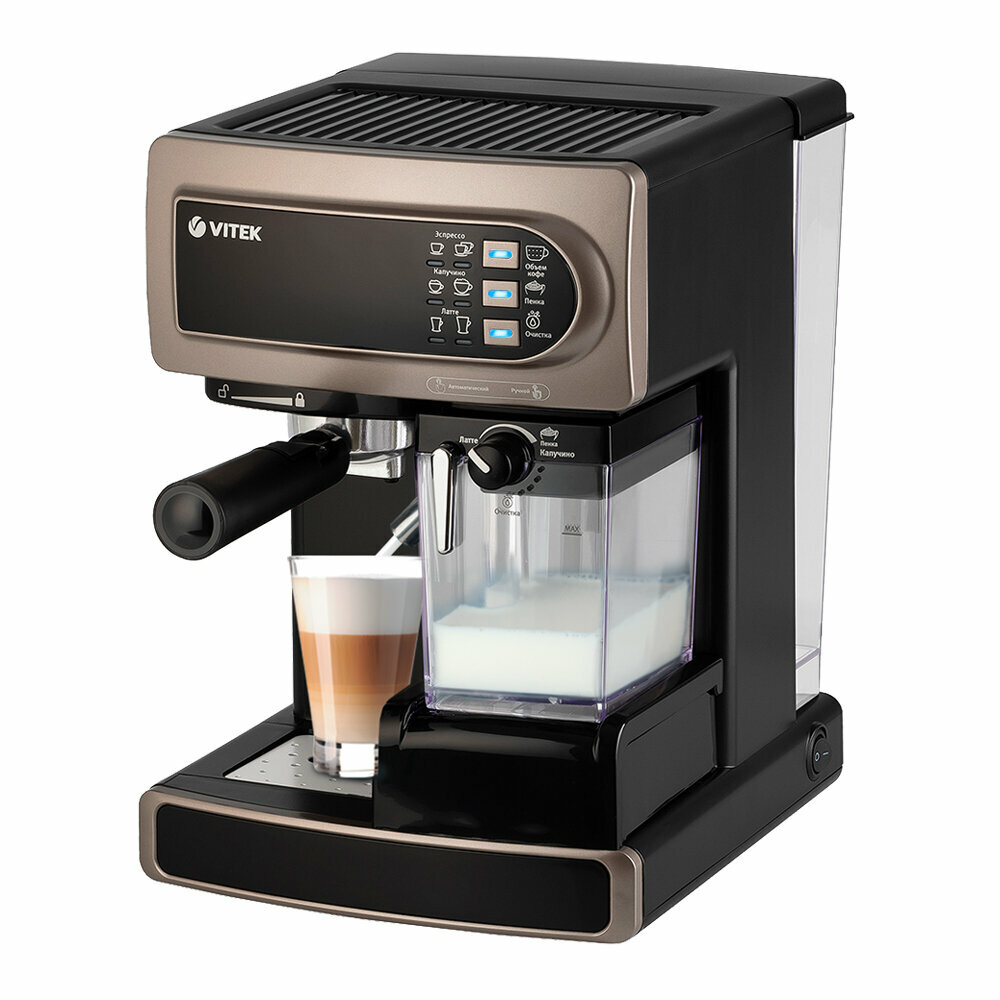 Следующая модель кофемашины от фирмы Vitek отличается наличием ёмкости для молока, что позволяет приготовить капучино в автоматическом режиме. Ёмкость для молока рассчитана на 300 мл, а ёмкость для воды на 1.65 литра.