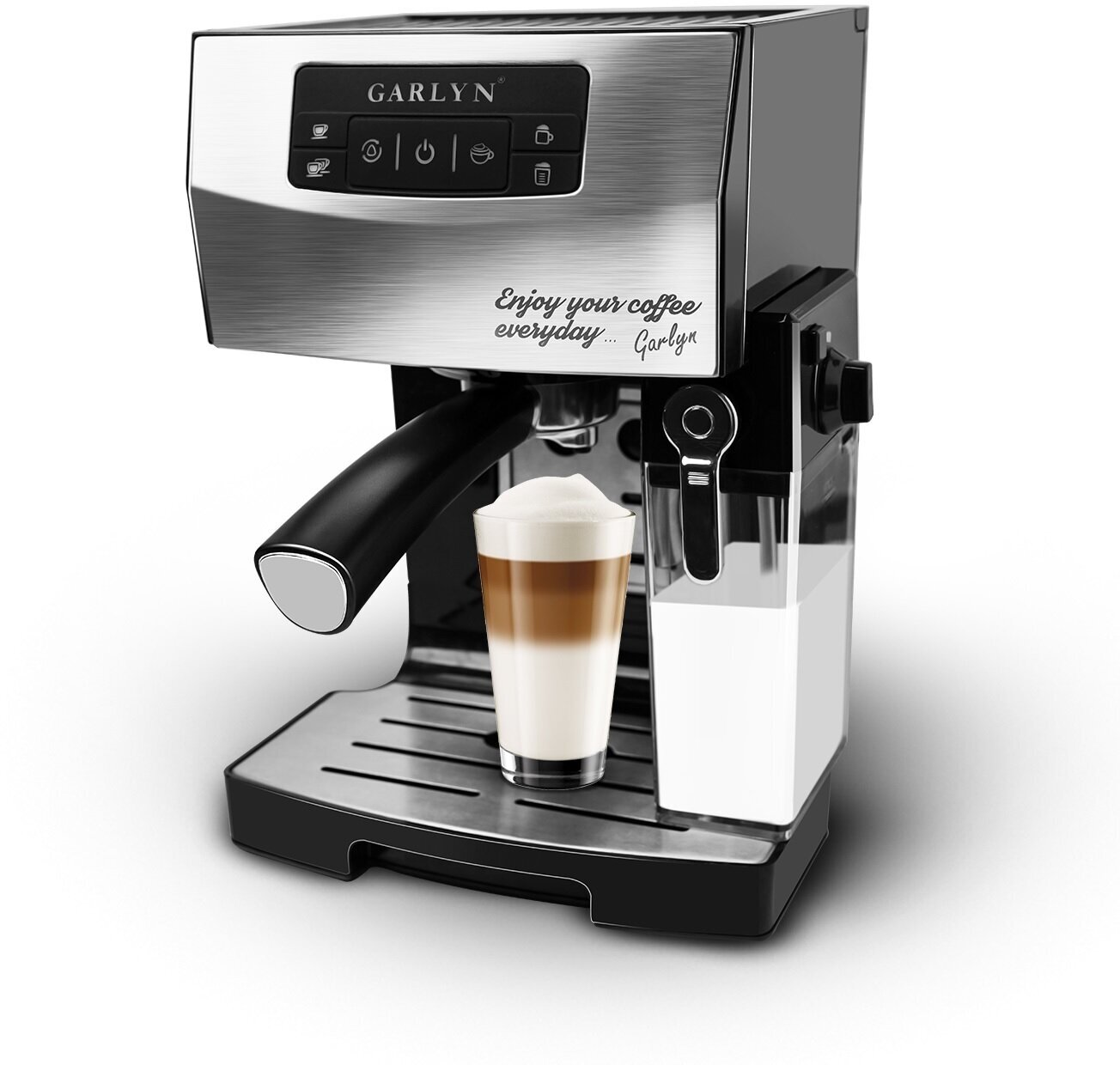 Далее следует отличный, на мой взгляд, вариант машины по состоянию цены и качества от фирмы Garlyn. Кофемашина имеет итальянскую помпу, которая при приготовлении кофе создаёт давление в 15 бар.