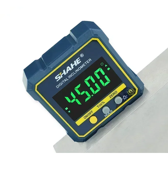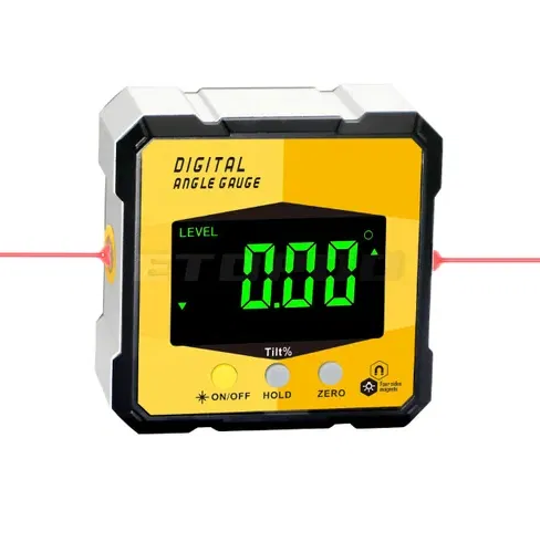 С магнитным основанием, ЖК-дисплеем с подсветкой и поддержкой как абсолютных, так и относительных измерений. Прибор рассчитан на диапазон 4x90°, обладает точностью +-0.2° и разрешением 0.05°. Оснащён функцией удержания данных и автоматическим реверсом экрана при перевороте.