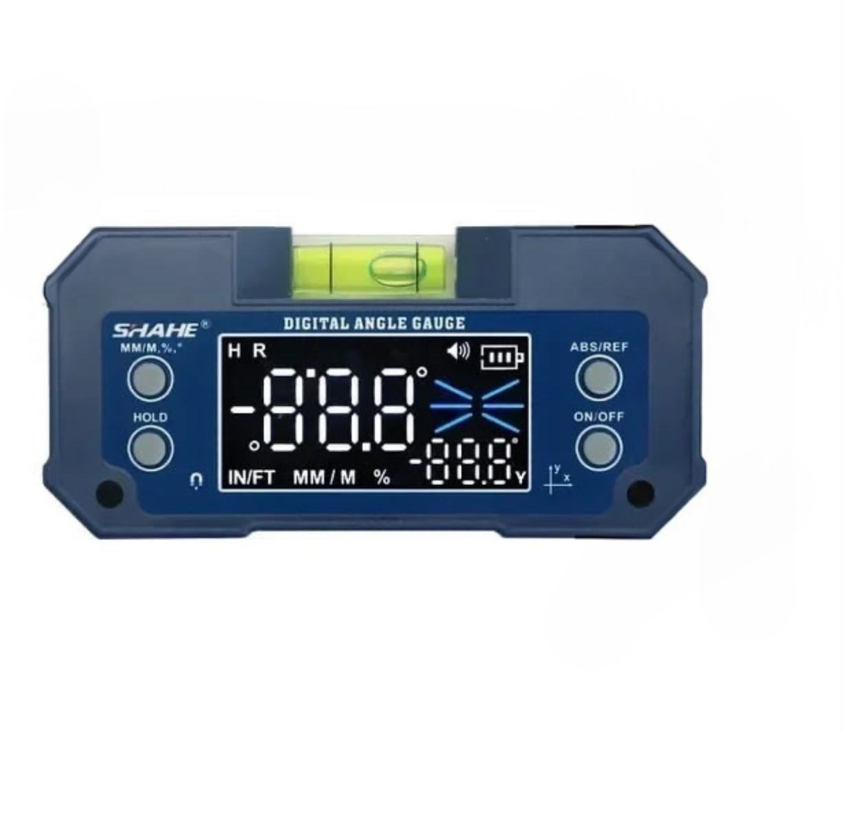 Двухосевой инклинометр с функцией уровня, предназначенный для точного измерения углов и наклонов в двух плоскостях. Поддерживает как абсолютное, так и относительное измерение, позволяет фиксировать данные на экране и переключать единицы между мм/м, градусами и наклоном (%). Оснащён крупным дисплеем с подсветкой и встроенными магнитами для крепления на металлические поверхности.