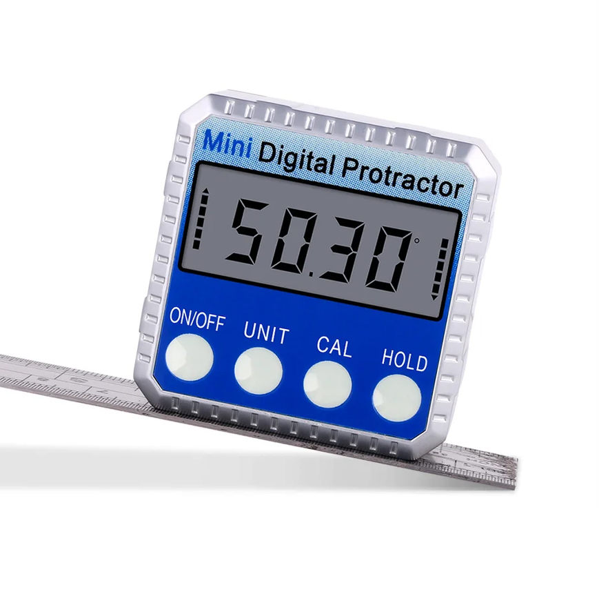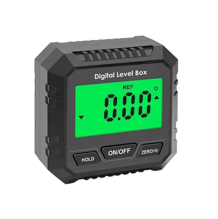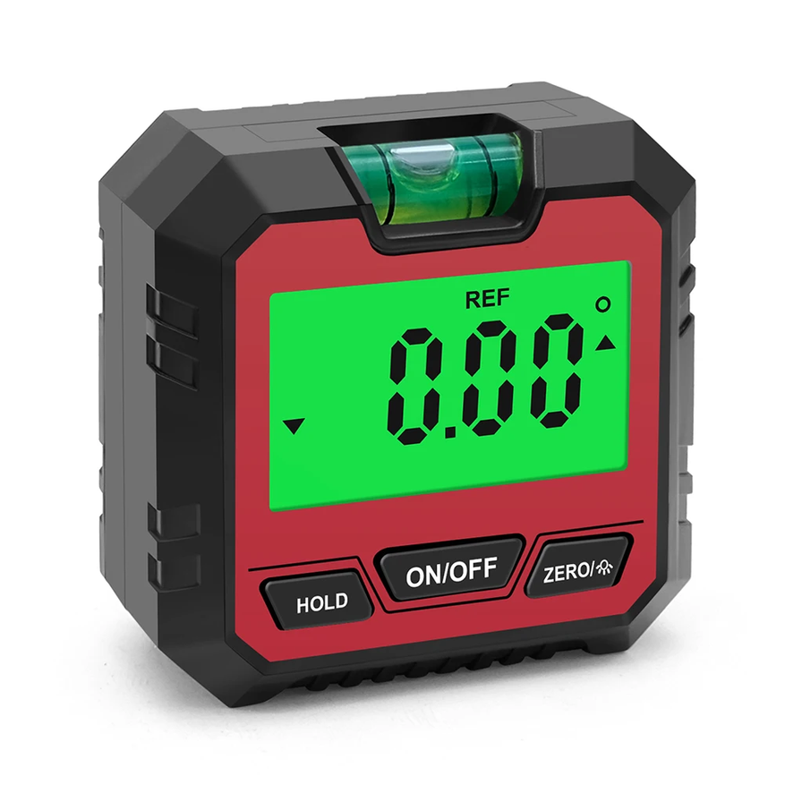 Экран с высокой точностью отображает угол наклона, повторяемость — 0.1°. Работает от батареек (в комплект не входят), предназначен для деревообработки, строительства, авторемонта и монтажа. Подходит для измерения углов фаски, установки оборудования, проверки уровней и выравнивания.
