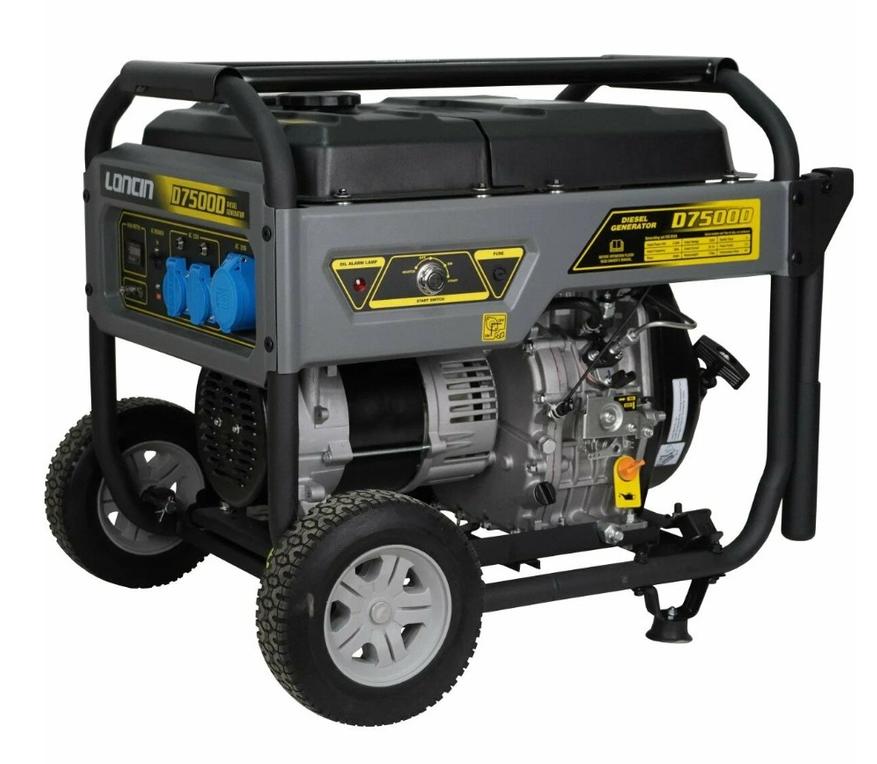 Loncin LCD7500D рассчитан на 5 кВт. Двигатель D460FD объёмом 462 кубов запускается как вручную, так и электрически, что делает его универсальным для любых условий. Генератор выполнен сбито и завершенно, а толчтые резиновые покрышки на колесах позволят перемещать его рактически по любому покрытию.
