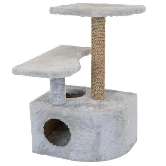 Трёхуровневая конструкция порадует вашего питомца. Комплекс имеет следующие размеры. Когтеточка-столбик — 52x8 см. Полочка — 25x25x2 см.
