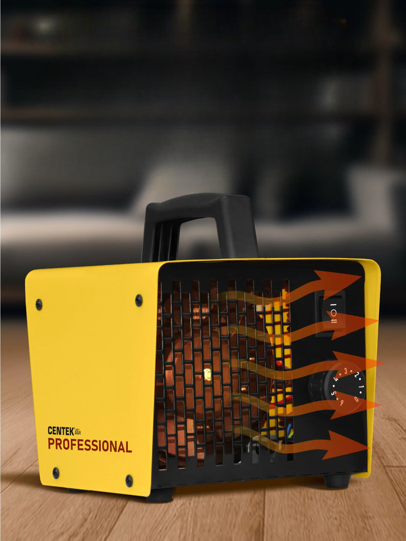 CENTEK представляет компактный керамический тепловентилятор жёлтого цвета, рассчитанный на обогрев помещений площадью до 25 м². Модель оснащена нагревательным элементом мощностью 2 кВт.