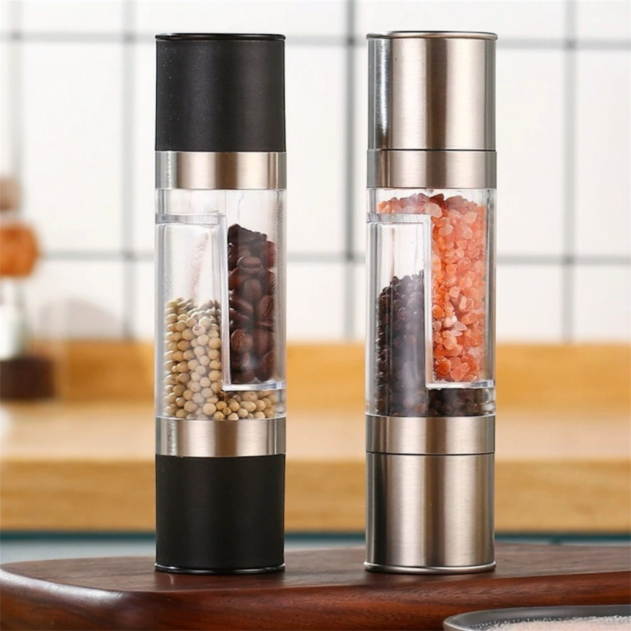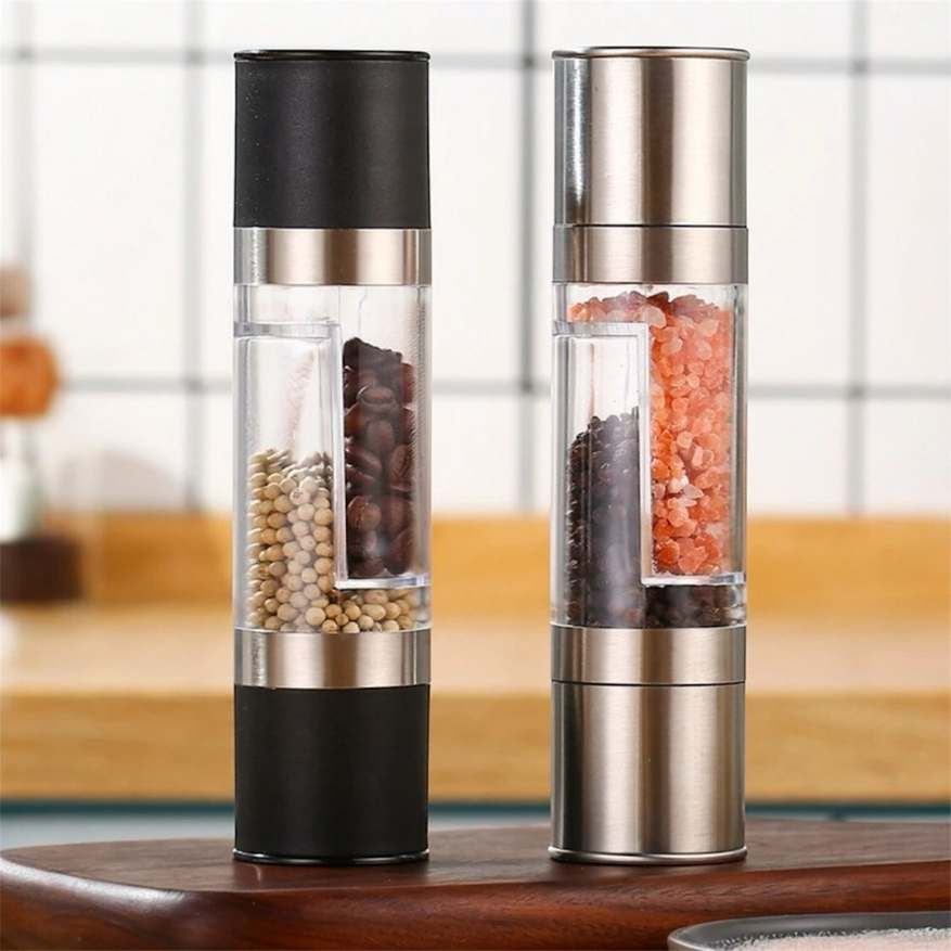 Мельница для соли и перца Gingira 2-в-1 — это вертикальный двухсторонний измельчитель, который объединяет сразу два резервуара: под соль и под перец. Корпус сделан из металла и пластика, внутри установлен керамический механизм, который дает равномерный помол и не ржавеет. Размеры у модели заметные: высота около 20,5 см, диаметр 5 см, вес примерно 252 г. Есть два варианта исполнения — с металлической головкой или с пластиковой, но конструкция у обоих одинаковая. Степень помола регулируется вручную, можно сделать помол крупнее или тоньше в зависимости от блюда. Прозрачная центральная часть позволяет видеть остаток соли и перца. Подходит для черного и белого перца, морской соли и других твердых сухих специй. В комплект входит одна мельница формата 2-в-1.