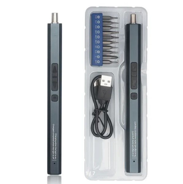 Для начала хочу обратить ваше внимание на довольно бюджетную электрическую отвертку от бренда Wozobuy. В бюджетную поставку входит сама отвертка, небольшой набор бит и кабель зарядки. Однако, у продавца есть и более дорогая комплектация с большим количеством бит и пластиковыми лопатками для разборки различных устройств.