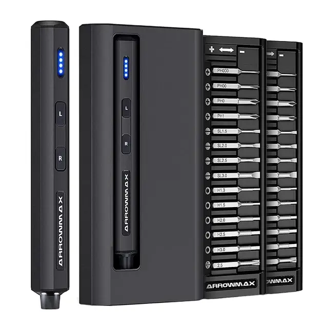 Электрическая отвертка от компании ArrowMax точно заслуживает внимания при выборе. Модель поставляется в удобном кейсе, в котором размещено 28 комплектных бит.