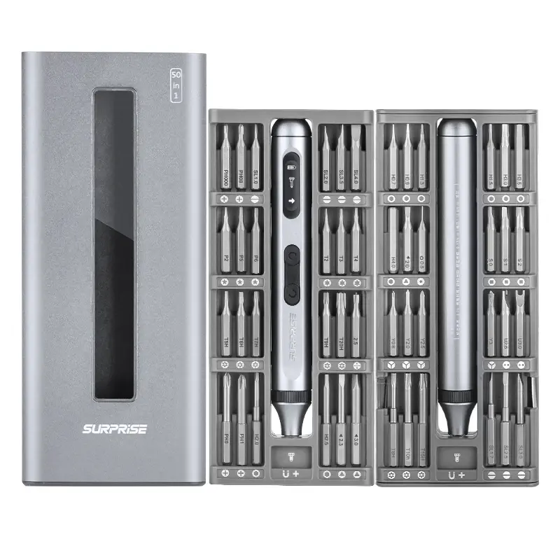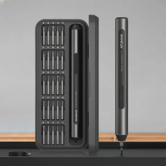 Модель от компании Duka поставляется в удобном пластиковом кейсе, в котором помимо отвертки имеется 25 сменных бит с разнообразными наконечниками для мелких работ с различной техникой.