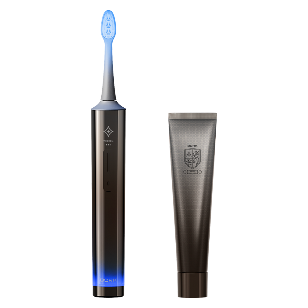 В набор входит звуковая зубная щётка и паста с отбеливающим эффектом. Щётка работает с LED-подсветкой, а паста содержит перлит — мягкий природный абразив. Он помогает очищать поверхность зубов, поддерживать эмаль и делает улыбку светлее. При включении синего света активные вещества пасты запускают процесс осветления.
