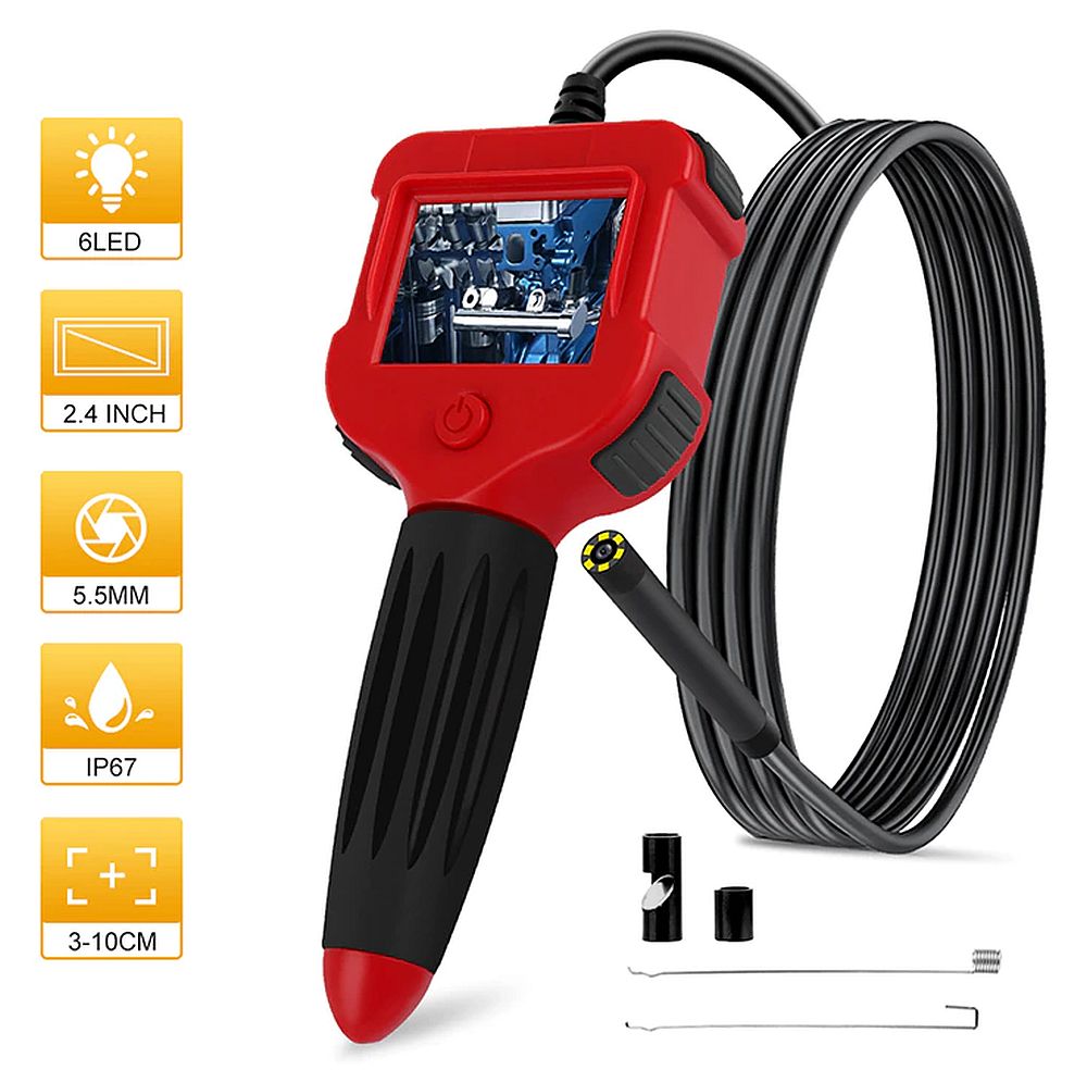 Классная машинка с возможностью поворота обзорной камеры на конце зонда с помощью рукоятки, расположенной на основном блоке. В качестве дисплея эндоскоп использует смартфон на базе IOS или Android, для которого есть специальное крепление. Подключение осуществляется по кабелю. Камера 5.5 или 8.5мм с разрешением 1280*720P. Поворачивая камеру на 360 градусов можно осмотреть все рабочее пространство, например, внутри двигателя. Жалко только, что длина зонда всего 1м.