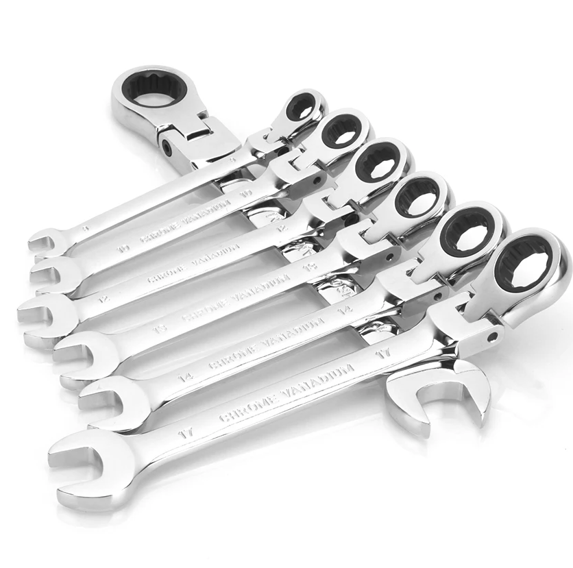 Выполнен из хромованадиевой стали, представлены варианты на работу с крепежом размером от 6 до 12 мм. Конструкция комбинированная и двусторонняя: с одной стороны классический рожковый профиль, с другой — накидная головка с храповым механизмом на 72 зуба, что позволяет работать с минимальным углом поворота. Головка шарнирная, с гибким вращением, поэтому ключ удобно использовать в стесненных зонах, особенно при ремонте автомобильных узлов и механизмов. Инструмент прошел термообработку, полностью отполирован, устойчив к износу и коррозии, поверхность не скользит в руке. Формат разборный, ориентирован на регулярное и длительное использование, в том числе в промышленной и сервисной среде.
