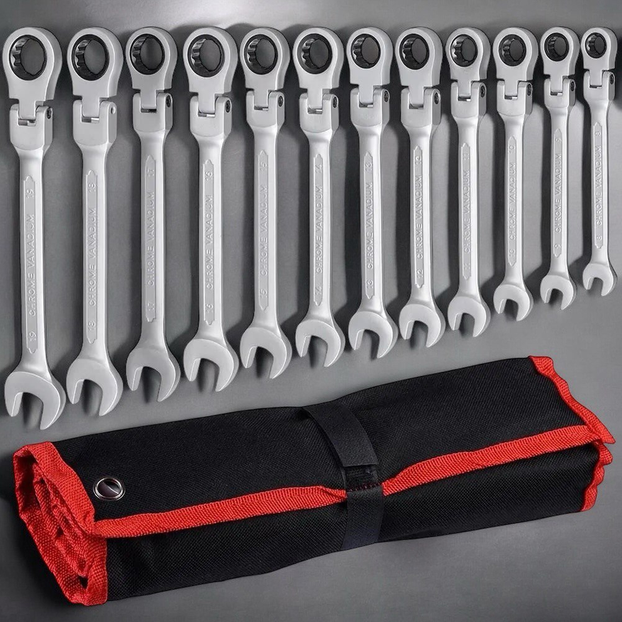 Выполнен из хромованадиевой стали и рассчитан на работу с металлическим крепежом в условиях ограниченного доступа. Конструкция комбинированная: с одной стороны классический рожковый профиль, с другой — накидная часть с трещоткой и шарнирной головкой, которая может отклоняться под углом для обхода препятствий. Поверхность инструмента антикоррозионная, с защитой от скольжения, материал устойчив к давлению и длительной нагрузке, что позволяет использовать комплект не только в быту, но и в ремонте автомобилей и промышленном обслуживании. Продается в тканевом чехле.