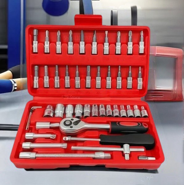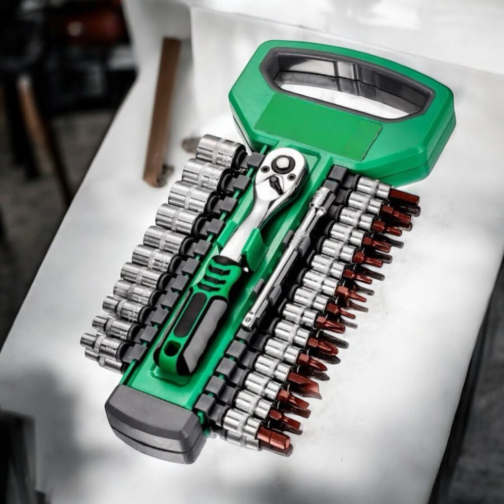 Набор инструментов Amagi из 46 предметов поставляется в жестком пластиковом чемоданчике, который защищает оснастку при хранении и перевозке, при этом доступен в трех цветах — черном, красном и зеленом. Внутри все элементы разложены по формованным посадочным местам, ничего не болтается и не выпадает при переноске. Основа набора — ручка с храповым механизмом на 24 зуба под квадрат 1/4 дюйма, комплект торцевых головок, биты из стали S2, удлинители разной длины, гибкий удлинитель, Т-образная рукоять, спиннер и вспомогательные адаптеры. Рабочая часть инструмента выполнена из хромованадиевой стали с зеркальной полировкой, биты рассчитаны на регулярную нагрузку, набор ориентирован на обслуживание автомобиля, техники и бытовой ремонт.