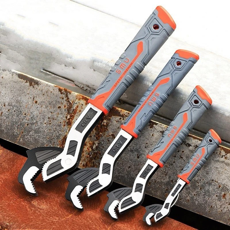 Из хромованадиевой стали выполнен в классическом формате с винтовой регулировкой губок и выпускается в четырех размерах: 6 дюймов (150 мм, захват 7-15 мм, 85 г), 8 дюймов (200 мм, 9-25 мм, 214 г), 10 дюймов (286 мм, 15-35 мм, 286 г) и 12 дюймов (300 мм, 19-43 мм, 300 г). В отличие от предыдущего самозатягивающегося двустороннего ключа, здесь размер выставляется вручную, что снижает скорость работы, но дает более жесткую фиксацию и лучший контроль усилия при затяжке и срыве крепежа, особенно в силовых и точных операциях.