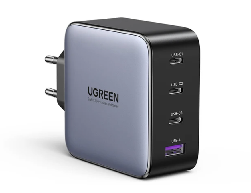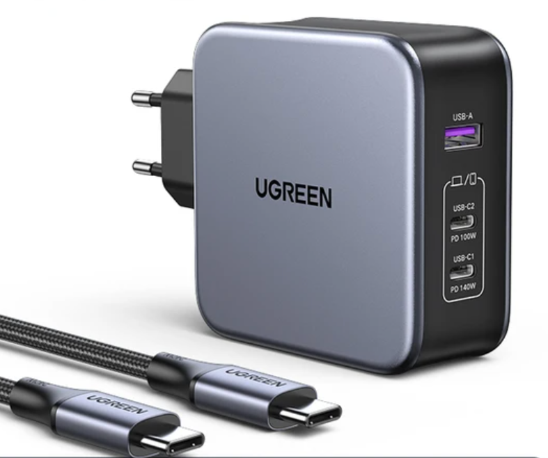 UGREEN GaN 140W Charger (CD289). Этот вариант будет полезен тем, кто ценит скорость и удобство. Зарядное устройство выделяется высокой мощностью и возможностью одновременного подключения нескольких устройств, включая ноутбуки и телефоны. Компактные габаритные размеры и высокая мощность собраны в небольшом корпусе.